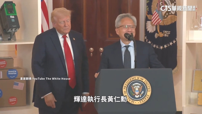 美國總統川普:「仁勳你能上來說幾句話嗎?他是個聰明人。」在如雷的掌聲中走上講台,與美國總統川普握手,輝達執行長黃仁勳,在白宮的「投資美國」記者會上,發表談話。輝達執行長黃仁勳:「我們也需要一個以成長,和產業為導向的進步能源政策,這也是總統(川普)正全力推動的,我真的很感謝。」