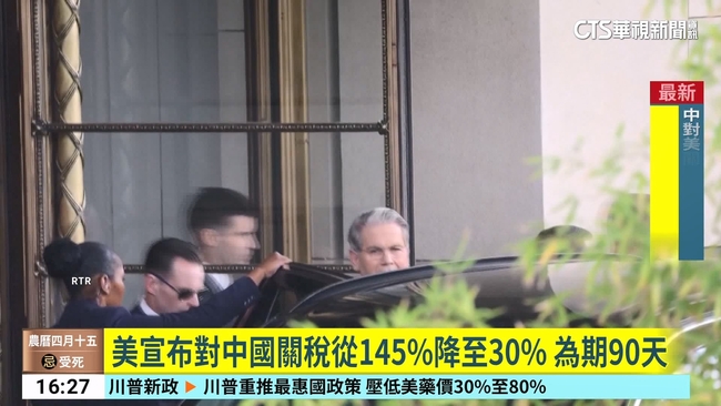美國財政部長貝森特表示,美中已經針對關稅暫緩90天達成協議,雙方將在90天內互相下調115%的關稅。等於各自降到30%和10%,實施期間為90天。