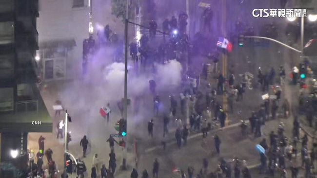 美國加州洛杉磯為了聲援移民。民眾昨(9)日再度聚集在聯邦大樓前,跟國民兵和洛城警察對峙。入夜之後示威群眾持續占據街頭,朝軍警或人群丟擲鞭炮和信號彈,軍警則發射催淚瓦斯回擊。洛城該如何恢復秩序,聯邦政府和加州官員意見分歧。美國總統川普出動700名海軍陸戰隊隊員,並再增派2千名國民兵,強調要恢復法律與秩序;但加州官員抨擊,總統在做沒必要的事,只會讓局面越來越亂。