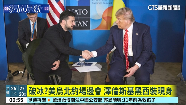 美國總統川普在北約峰會場邊,與烏克蘭總統澤倫斯基,舉行閉門會議,2人會談的照片正式曝光。