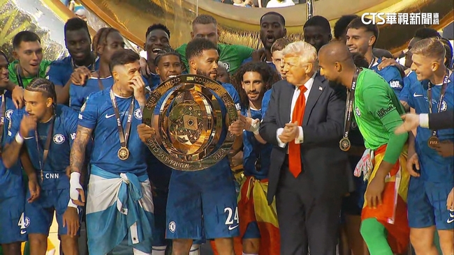 可以看到川普和國際足總主席「因凡蒂諾」,一起把世俱盃冠軍獎盃頒給奪得冠軍的英超勁旅切爾西。川普頒完獎後,還留在舞台中央一起慶祝,但隨即就被「因凡蒂諾」拉到球員們身後。