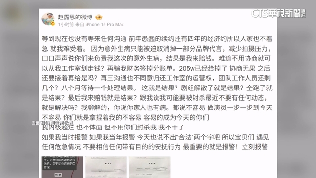 趙露思在微博開撕經紀公司,她透露自己因生病而被迫取消部分品牌代言,以減輕工作壓力,公司曾說要負責,但最終換來的結果卻是她賠了845萬元,最讓趙露思心寒的是,經紀公司竟以封殺作為威脅,要求她最近不要有任何動態,她也回嗆「不用你們封殺我,我不幹了」!目前經紀公司尚未有說明。