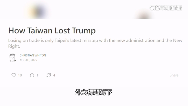 斗大標題寫下,台灣如何失去川普,這是川普前幕僚惠頓,5日的公開發文,洋洋灑灑上萬字,敘述台美關係,惠頓觀點包含,台灣的國防預算晶片,以及我國試圖接近川普的公關管道,川普重視各國政府的國防預算,賴政府雖然曾說,希望讓國防預算,占GDP的比重超過3%,但實際上台灣卻是減少。