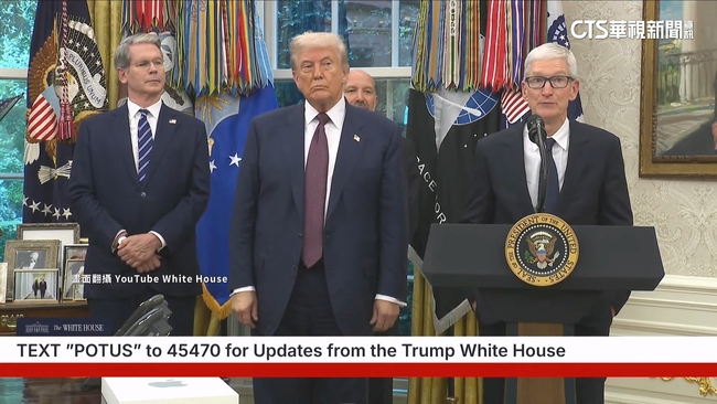 蘋果執行長庫克,親自到白宮和川普宣布這項好消息,還帶了小禮物,蘋果執行長庫克說:「這是一件獨特的禮物,上面刻著獻給川普總統。」這件用手機玻璃面板製作的圓形展示品,底座來自猶他州鍍上24K金,玻璃則出自美國康寧生產線,讓川普大讚,終於在美國本土做這些東西,至於台灣沒有豁免的企業,又該如何面對。