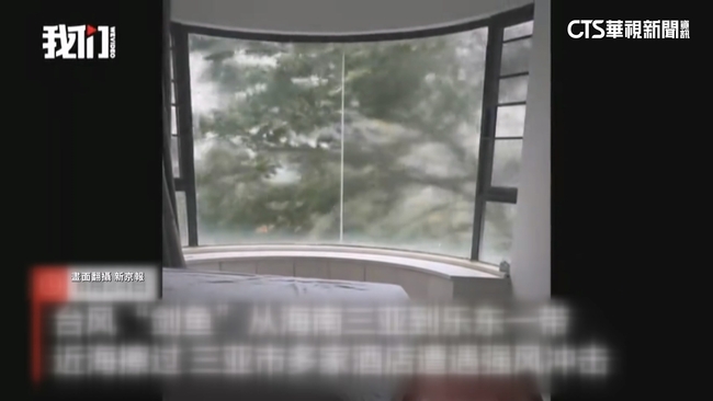颱風來襲狂風猛吹,飯店員工用身體撐住大門,防止被風吹倒,但狂風依然灌入大廳,還導致停電,劍魚颱風過境海南島,最南方城市三亞首當其衝,當地氣象局表示,這是40年來三亞遇過最強的颱風。