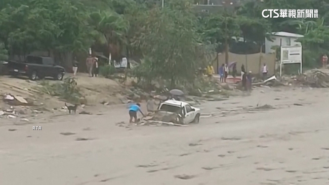 可以看到街道上被土石色的泥水淹沒,還有路面被洪水沖出巨大裂縫和坑洞;還有好幾輛車卡在滿是碎石的泥流中動彈不得,民眾只能在泥流中冒險步行、或是騎機車移動。目前洛雷娜已經減弱為熱帶風暴,但是墨西哥氣象單位警告,週末還會出現強降雨,仍可能發生土石流。