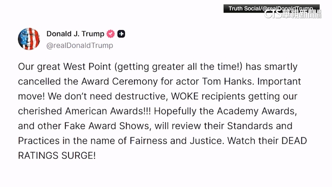 美國西點軍校校友會,在今年5月宣布,將頒發2025年「西爾維納斯·塞爾獎」,給奧斯卡影帝「湯姆漢克斯」,沒想到近期卻突然取消頒發榮譽表彰,外界猜測,這可能和他的政治立場有關。