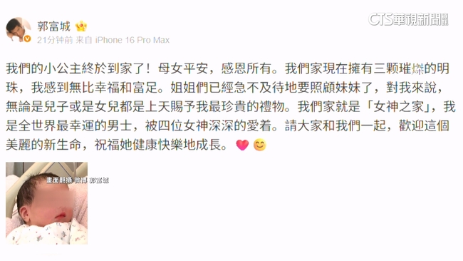 郭富城曬出照片報喜,寫下我們的小公主終於到家了,現在家裡有三顆璀璨明珠,實在相當幸福。他也透露,兩個女兒已經迫不及待要照顧剛出生的妹妹,更說家裡根本就是女神之家,能被老婆跟三名女兒深愛著,直呼自己是全世界最幸運的男士。