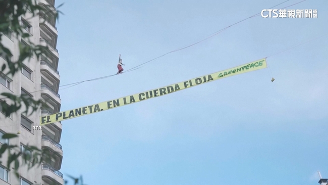 聯合國氣候峰會「COP30」10日在巴西開幕,與此同時,在西班牙馬德里,環保運動組織「綠色和平」有成員在西班牙馬德里街頭走鋼絲,呼籲各界採取更實際作為阻止氣候變遷。