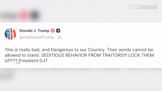 美國CNN主播說:「他(川普)說這真的很糟糕,對我們國家非常危險,他們的言論不容存在,這則貼文還有後續,這些大寫文字寫著,煽動叛亂行為,應處死刑。」民主黨影片發布後,川普整個氣炸,認為民主黨刻意鼓勵軍方,反抗三軍統帥,連續在真實社群上PO了16則貼文,甚至還脫口表示,要判處這六名議員死刑,白宮則是力挺川普發言。