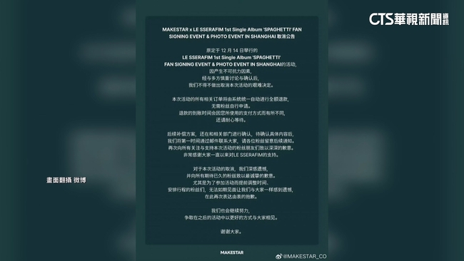 LE SSERAFIM原定今(14)日要在上海與粉絲相見歡,主辦單位卻臨時在12日緊急發布公告,這次的見面會確定取消,原因是「不可抗力因素」。主辦單位也承諾,所有相關訂單將進行全額退款,請大家耐心等候。不少網友猜測,恐怕與隊內有2位日籍成員有關。
