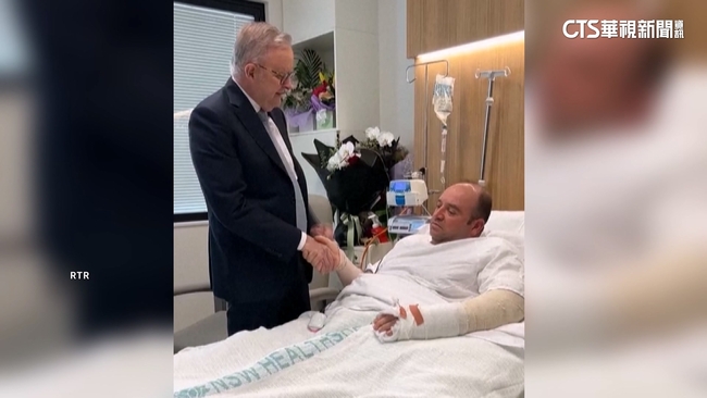 澳洲總理艾班尼斯VS.艾哈邁德說:「(你)很堅強,謝謝你,你非常堅強,謝謝,你的勇氣令人敬佩。」艾哈邁德的移民律師伊薩指出,艾哈邁德的左手臂大概中了5槍,其中一顆卡在左肩胛骨的子彈還沒取出,嚴重傷勢可能導致他的左手臂不保,而關於槍手父子,澳洲警方目前確認,爸爸沙吉德阿克拉姆,原籍是印度海得拉巴。
