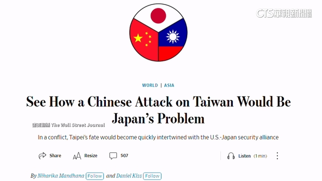 CNN駐台資深特派員分析,另外兩項關鍵因素,就是美國對台軍售和日本首相高市早苗的「台灣有事」論。而美日也是其他國際媒體,分析台海衝突時,無法忽略的關鍵。華爾街日報指出,一旦發生台海衝突,台灣需要美國加入戰鬥,美軍為了有效作戰,還需要日本支援,換言之台灣的命運將與美日緊密交織。彭博則指出,台灣對美日兩國而言,是遏制中國,保障貿易路線的重要堡壘。