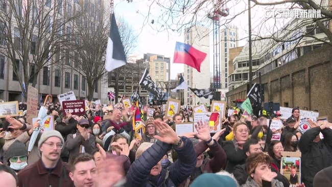 英國政府將在20日決定,是否核准「中國超級使館建案」,對此,維權團體17日聚集數百人,在倫敦街頭舉行大規模抗議活動,現場出現台灣國旗還有香港光復旗,英國反對黨黨魁「巴登諾克」也到場力挺,呼籲當局對抗北京施壓。