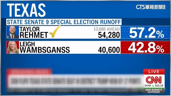 CNN主播柏奈特說:「民主黨翻轉了德州參議院席位,這個席位是川普全力爭取的,也是自1992年以來,每次選舉都由共和黨掌控的席位。」德州第九選區過去近35年來由共和黨把持,民主黨候選人「雷梅特」,擊敗共和黨候選人「萬姆斯甘斯」,被視為是共和黨,在期中選舉前的「一記警鐘」。