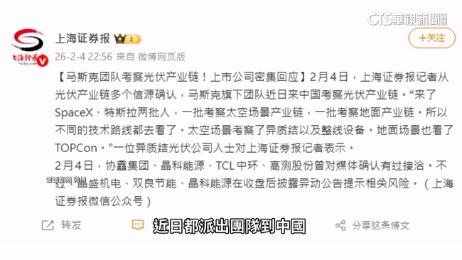 中國上海證券報報導,馬斯克擔任執行長的,SpaceX和特斯拉兩間公司,近日都派出團隊到中國,考察光電產業鍊,涉及設備矽晶圓和電池模組,其中重點考察異質結,和鈣鈦礦技術路線的光電企業。