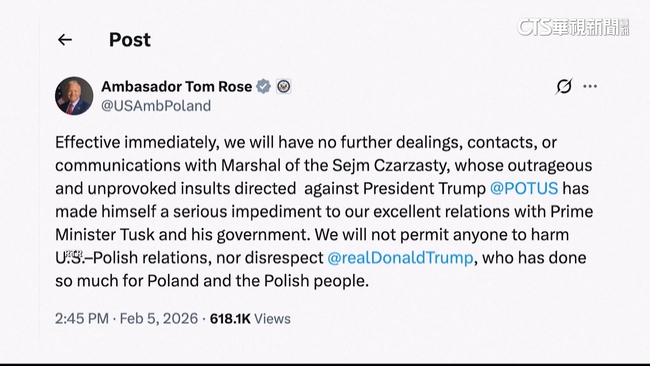 美國駐波蘭大使羅斯在5日突然宣布,停止與波蘭眾議院議長查札斯提的往來、接觸與溝通,並且稱他「無端侮辱了川普總統」,疑似指的是,波蘭議長最近批評美國總統川普「不配獲得諾貝爾和平獎提名」的言論。