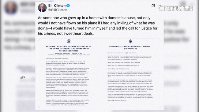 已故性犯罪富豪艾普斯坦相關風波持續延燒,繼美國前國務卿希拉蕊後,她的丈夫,美國前總統柯林頓,也在27日出席國會的閉門聽證會。柯林頓本人在聽證會後並沒有現身,但他透過書面聲明強調,他並沒有做錯任何事。