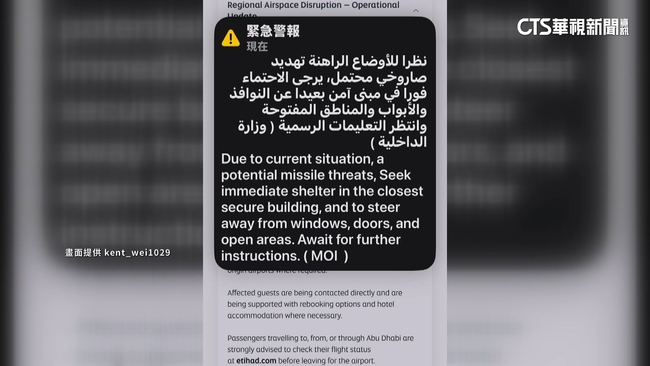 旅客表示,他在得知美伊衝突消息後,是希望能儘快搭車前往機場,搭乘最快的航班回台灣,但是在路邊等計程車時,收到空襲警報,幸好他及時躲避回到建築物內,沒有受到影響,但航班停飛,目前只能先採買物資應急,並找飯店休息,也希望能夠儘快返台。