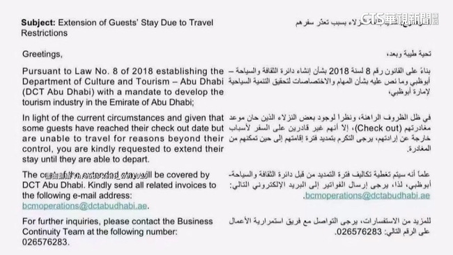 因為美以伊戰爭滯留杜拜,除了可能訂不到回家的機票,還有增加的住宿費用,讓黃先生焦慮沮喪,而這張航空公司取消信件,讓他有免費住宿緩解壓力,滯留杜拜台籍旅客黃先生說:「阿布達比官方政府的一個公告,說所有被取消航班離境的這些旅客,他們的政府會提供一切免費的住宿,直到我們可以再飛出去為止。」