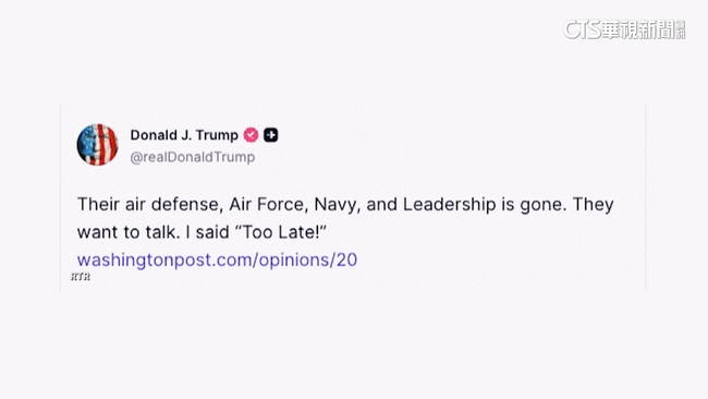 美國總統川普在一小時前發文,表示伊朗德黑蘭當局正尋求和美國對話,但為時已晚。