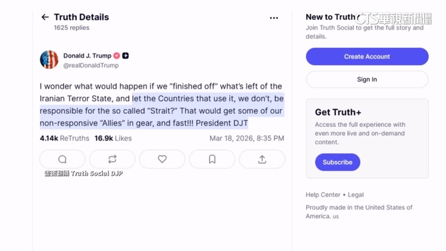 川普在社群媒體上寫道「假使美國將伊朗恐怖主義國家殘存的部分『解決掉』,並且讓使用荷姆茲海峽的國家自行負責,會發生什麼事呢?川普寫到,應該會讓一些遲遲沒有反應的『盟友』迅速動起來吧!」