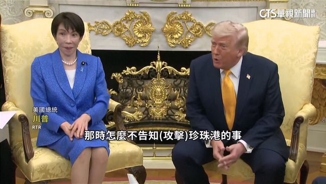 美國總統川普說:「我們就是要出其不意(攻打伊朗),有誰比日本更懂奇襲,那時怎麼不告知(攻擊)珍珠港的事。」高市聽了立刻瞪大眼睛,明顯倒抽一口氣,微笑中帶點尷尬,顯然沒想到會被川普,用珍珠港典故「奇襲」。