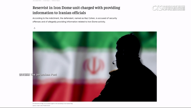 以色列自豪的鐵穹防空系統,至今攔截來自伊朗,和其他周遭敵對國家的空襲,操作這套系統的部隊,日前卻傳出有內鬼。綜合以色列媒體報導,一名住在耶路撒冷的26歲後備軍人柯恩,涉嫌洩漏各類機密給伊朗。根據以色列警察和國內安全機構「辛貝特」調查,柯恩過去曾在鐵穹防空部隊服役,如今被抓包接觸伊朗情報員長達多個月,期間洩漏軍事基地位置、國安官員名單等資訊。