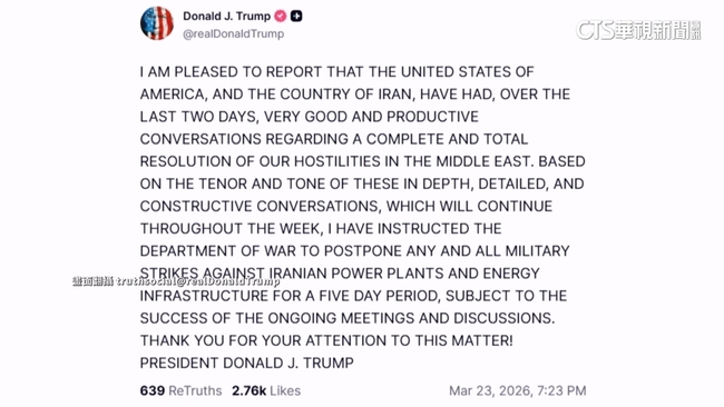 川普說,美國和伊朗在過去兩天,針對徹底解決雙方在中東的敵對行動,進行良好且富有成效的對話,雙方本週會繼續進行對話。鑑於這些深入、詳細和具建設性的對話基調與氛圍,他已經指示國防部,暫停對伊朗發電廠和能源基礎設施的一切軍事打擊,為期5天。