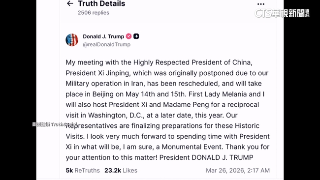 TruthSocia川普發文照片,川習會最終日期看似定調了,美國總統川普26日發文,表示中國國家主席習近平的峰會,將在5月14、15日於北京舉行,也表示非常期待這場歷史性的峰會, 白宮發言人李威特說:「第一夫人梅蘭妮亞和總統川普,也會在華府招待習主席夫婦回訪,日期會在今年稍晚的時間。」