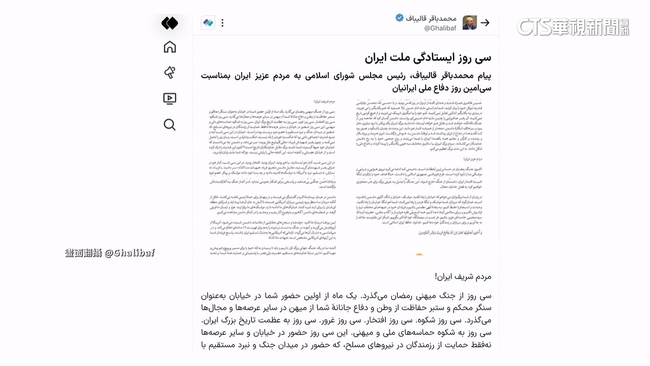 NHK主播引述議長聲明:「(卡利巴夫警告美國)說伊朗的軍隊,已準備好應對任何美國地面攻擊,將激烈對抗到底不接受屈辱。」議長嗆聲不斷,表示我們正處於一場世界大戰之中,必須做好準備,迎接通往勝利的艱辛之路,將能懲罰美國到底。
