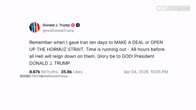 美國總統川普在3月26日時向伊朗祭出長達10天的協商期,預計將在台灣時間7日上午8點結束,距離最後通牒日只剩下48小時,川普再度警告伊朗如果不開放荷姆茲海峽,就等著迎接「地獄打擊」;不過伊朗當局也回嗆,表示如果美以持續轟炸伊朗的能源基礎建設,美國與以色列就等著「地獄降臨」。而在美伊雙方持續叫囂之際,半島電視台報導,美國F-15戰機另一名失蹤的飛官已順利由美軍救出,目前正準備撤離伊朗,並返回安全地點。