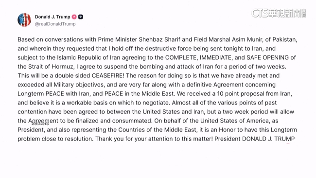 眼看川普通牒時間將至,巴基斯坦籲請美國總統川普能夠再延2個禮拜,暫緩對伊朗基礎建設的打擊。我們收到最新消息,幾分鐘前川普同意巴基斯坦的提議。