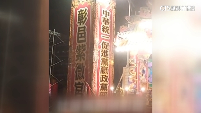 信徒們起轎子,迎接神明,位在彰化的宮廟到台中霧峰參加遶境活動,但神壇上掛的布條,除了標示宮廟名稱,還大大寫著中華統一促進黨