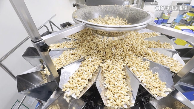 經過低溫烘烤的米米花,掉入包裝機,先經過秤重,確保每包重量都相同,接著分送到包裝輸送帶,繼續前進,包裝完成後,一包包米米花,就大功告成,有別於一般的爆米花,是用玉米高溫爆炒,業者採用台灣米,製作出米爆米花,結合米菓香氣,和爆米花的酥脆口感,成為年節熱銷零嘴,米米花品牌業務副總Jackey Chang說:「製程裡面我們是沒有用油去爆,從選米然後到研磨到中間的製程,到調味到後面烘烤階段,我們米米花總共有20幾道工序。」