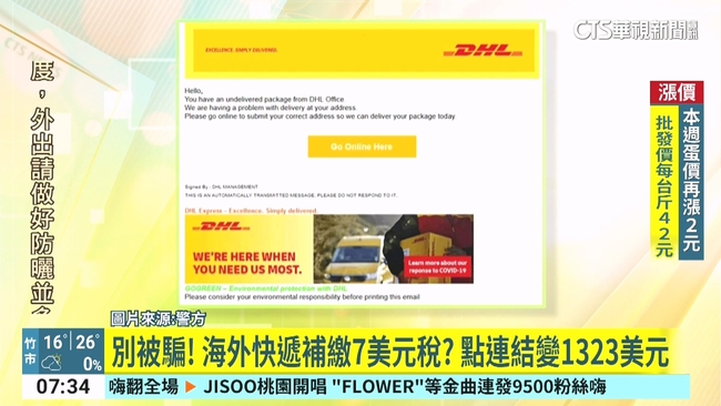 卻收到號稱是DHL寄來的email,信中說,要點連結補繳7美元稅款,但點下去輸入卡號,卻從7美元變成1323美元,刑事局提醒,對於來不不明的簡訊要提高警覺,如果不慎點了連結,也不要輕易給出個資。