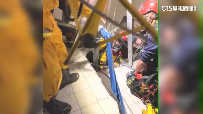 消防人員說:「好,可以過了,可以的話就你在下面,那個管子會影響到我的腳,這根。」消防人員戴上面罩,全副武裝小心翼翼,順著管線往下垂降,因為裡頭有2名工人受困,可惜被救起時,已經沒了生命跡象,送醫後宣告不治。