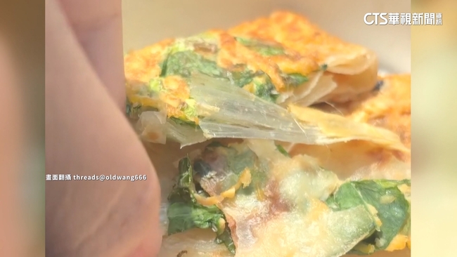 蔥抓餅在煎台上煎得吱吱作響,呈現金黃色後打上蛋,美味加分,不過有民眾外帶蔥抓餅回家後,卻發現裡面有異物,蔥抓餅和大片塑膠片,融合在一起,不知道是吃蔥還是吃塑膠,碗裡還有一絲一絲的塑膠條,當事人直呼誇張。