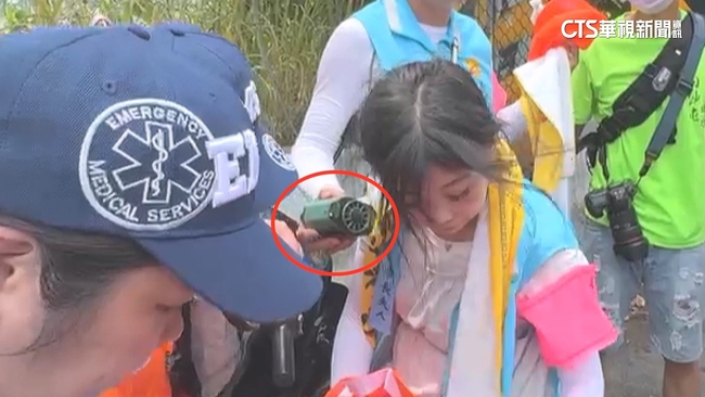 救護人員說:「先讓她在這邊休息。」經過將近4小時,也就是11點左右,市長夫人疑似不敵炎熱高溫,身體不適,人緊急被帶往路旁休息,救護人員上前替她測量血壓及血氧,救護人員說:「先坐著休息這樣。」擔心太太的神情全掛臉上,一手拿著冰水,一手拿小電風扇,在旁替她降溫,2人只能先搭車前進。