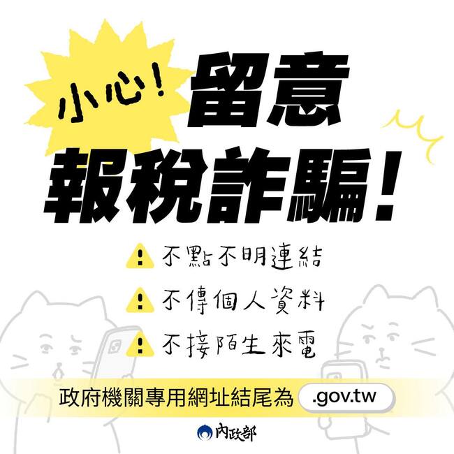 內政部指出,詐騙集團會假冒「國稅局」發送退稅通知或補件提醒,實際上是引誘民眾點入釣魚網站或進行ATM操作,「報稅很重要,資料安全更重要!」