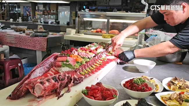 為了不讓色澤太單調,鮮紅龍骨上,妝點些許哇沙米及干貝,豐富視覺效果,成本粗估至少兩萬元,業者說為了招待好友及熟客,成本無價,暫時不打算販售,也希望藉此推銷屏東黑鮪,讓更多遊客品嘗美食。