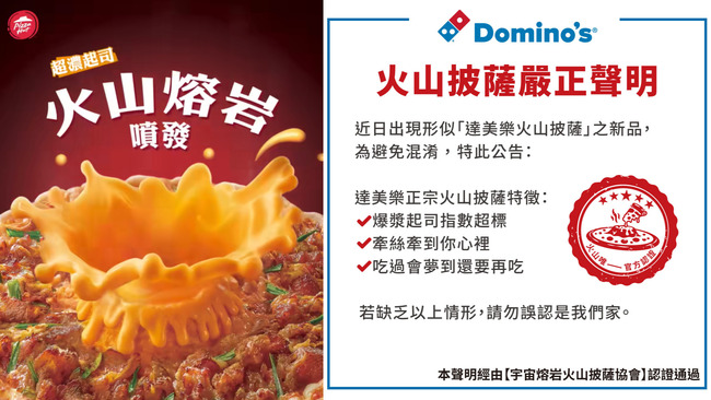 而達美樂也於臉書上發文指出,「近日市面上出現形似『達美樂火山披薩』之新品,為避免混淆,特此公告,達美樂正宗火山披薩特徵包含:爆漿起司指數超標、牽絲牽到你心裡、吃過會夢到還要再吃,若缺乏以上情形,請勿誤認是我們家。」
