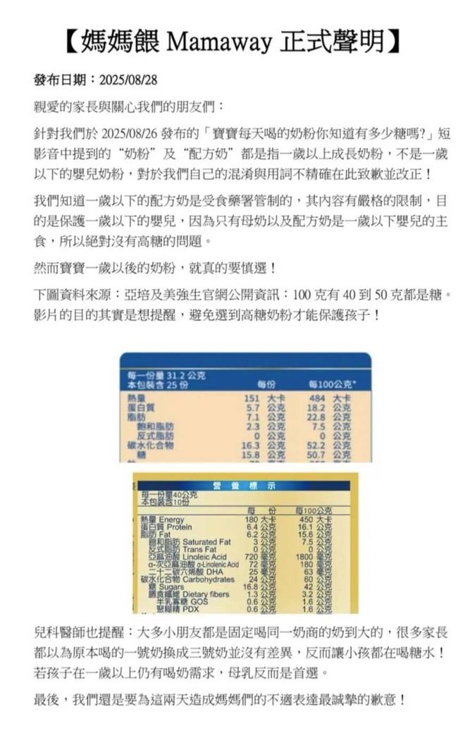 知名母嬰品牌「媽媽餵Mamaway」,因日前在一段影片中宣稱「嬰兒配方奶粉一瓶超過一半以上都是糖」,引發網絡爭議後,被許多專業醫師反駁,甚至連衛福部食藥署也公出面闢謠。對此,「媽媽餵Mamaway」昨(28)日晚間發布聲明,表示為「自己的混淆與用詞不精確在此致歉並更正」,不過還點名了知名品牌亞培、美強生的營養標示「100克有40到50克都是糖」,遭網友質疑根本是「提油救火」,而目前相關爭議影片及兩篇聲明都已下架。