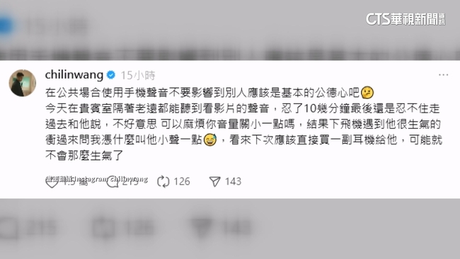 在公共場合使用手機,音量本來就不該太大。羽球金牌國手王齊麟發文分享,他在機場貴賓室休息,附近有人用手機看影片,聲音隔著老遠都能聽到,王齊麟忍不住上前提醒,沒想到對方下飛機後,竟追上去質問憑什麼叫我小聲一點,讓王齊麟很無奈,貼文一出,引發網友熱議。
