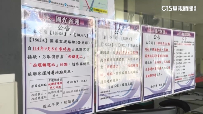 國光客運昨(8)日全面停駛台南、高雄、屏東等國道路線,同時結束雲林縣西螺轉運站經營權,但是在7日國光客運末班車駛離時,不少乘客超不捨,售票員在發車前,特別感謝乘客這些年的搭乘,雖然後續路線會由統聯客運接手,但民眾反應,站點在交流道附近,離市中心較遠,希望鎮公所及縣政府協調業者進駐市區,方便搭乘。