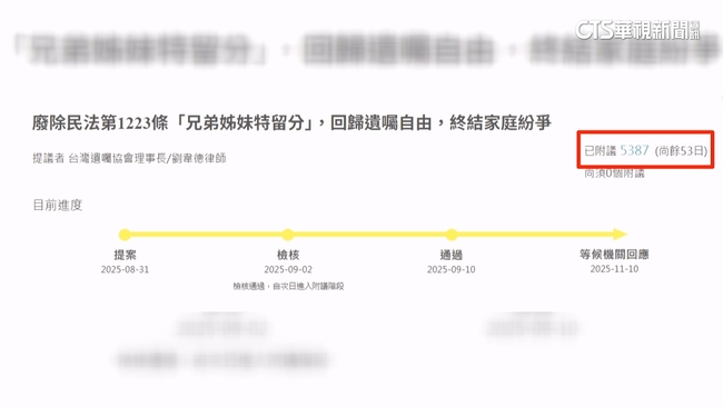 現在不少人選擇「不婚不生」,或是當頂客族,但百年之後的遺產分配,該怎麼辦,像是已故藝人羅霈穎,生前未婚未育,也沒有預立遺囑,經家人討論後,鉅額遺產最終由她的二哥來繼承,就是因為現行民法中,兄弟姊妹擁有第三順位的繼承權,即便預立遺囑,想把財產留給配偶或是特定人士,手足還是可以主張「特留分」,但就有民間團體認為,這樣的法規並不尊重當事人意願,提議廢除兄弟姊妹特留分,短短10天就獲得5000多人附議。