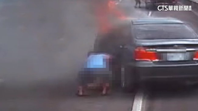 高速公路上,一輛轎車火燒車,駕駛倒臥在車門旁,其他車輛都紛紛閃避,但一名大貨車司機將車子停下下車救人,穿藍色衣服的就是大貨車司機,他不顧轎車還冒火,將受困的駕駛拖出轎車,拖出來的時候,轎車駕駛的雙腳也著火,司機又不顧安全的伸腳將火踩滅,再出手將鞋子脫掉,將人拖到到更遠的地方,另一位黑衣民眾也過來幫忙,拿滅火器對車頭猛噴,將火勢撲滅。