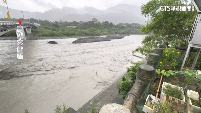 泥黃色的洪水不斷翻騰,猛烈水流撞擊河岸,發出轟隆巨響,就像是拍擊的大鼓,高雄六龜的荖濃溪,溪水高漲,還夾帶砂石,湍急的往下游沖刷,華視新聞記者陳珊珊說:「其實沿路都有一些這個人員在做戒備。」