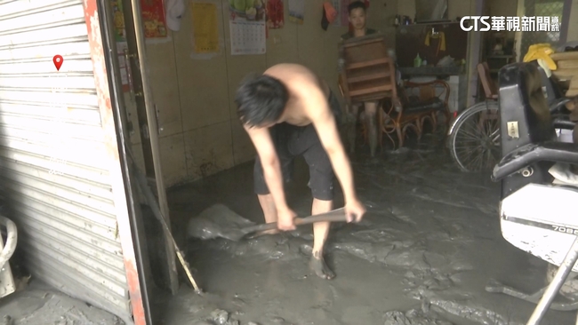 赤腳踩在泥地上,用鏟子一鏟一鏟想清淤,但花費九牛二虎之力,家裡還是一片狼藉,而後方的張小姐,也是家中成員,手搬家具雙腿膝蓋以上都是泥巴。