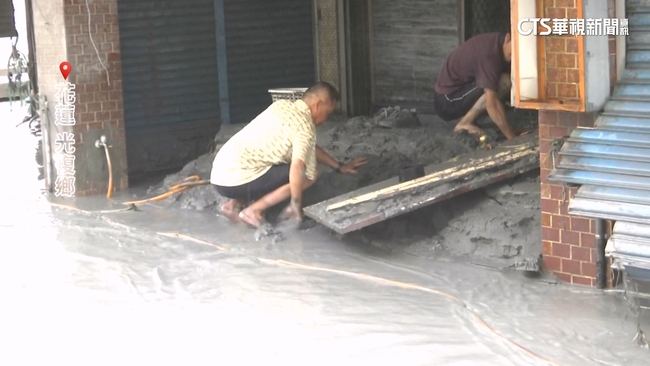 居民蹲在地上忙著清淤,街坊鄰里用推車載著工具,要整理家園,堰塞湖溢流水淹花蓮縣光復鄉,死亡災情集中聚集在山腳下的低窪處。